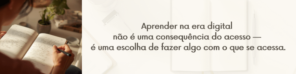 O que pode mudar é a postura do estudante diante desse ambiente. Aprender na era digital não é uma consequência automática de ter acesso — é uma escolha consciente de fazer algo com o que se acessa. De parar. De questionar. De construir sentido a partir do que foi recebido.